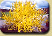Niederer, immergrüner Strauch mit kleinen, hellgrünen Blättern, Blüten goldgelb, ca. 1 m. | ||