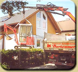 Sollte das Gartentor zu schmal sein, mit den Geräten in den Garten zu kommen, können wir unsereGeräte und Materialien, Bäume, etc. mit dem Kran über die Hecke oder die Mauer heben.